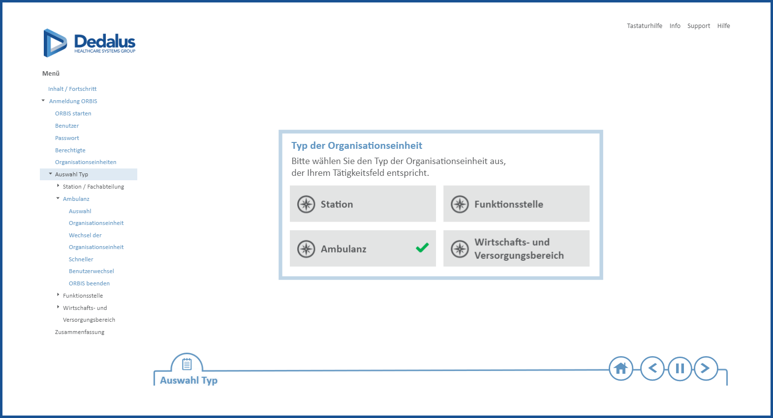 (Um das Training auf Ihre Tätigkeit im Krankenhaus auszurichten, können Sie im Training einen Typ auswählen: Station, Ambulanz, Funktionsstelle oder Wirtschafts- und Versorgungsbereich. Wenn Sie das Training für einen anderen Typ wiederholen, verlängert sich das Training um jeweils ca. 5 Minuten.)